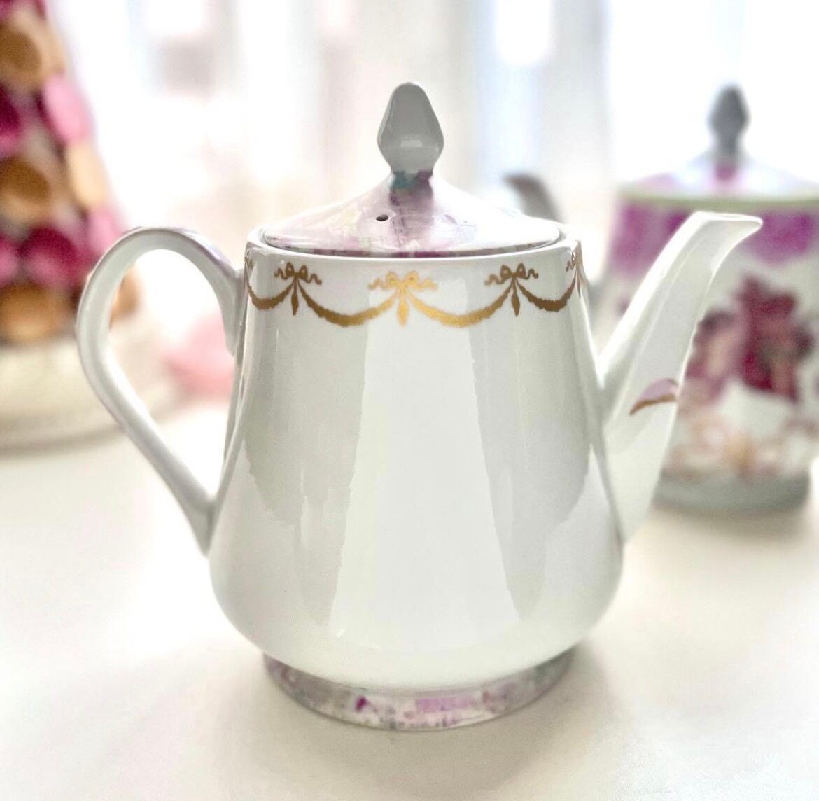 白い、大きなティーポットを大好きなマリーアントワネットで思い切りエレガントに仕上げました。