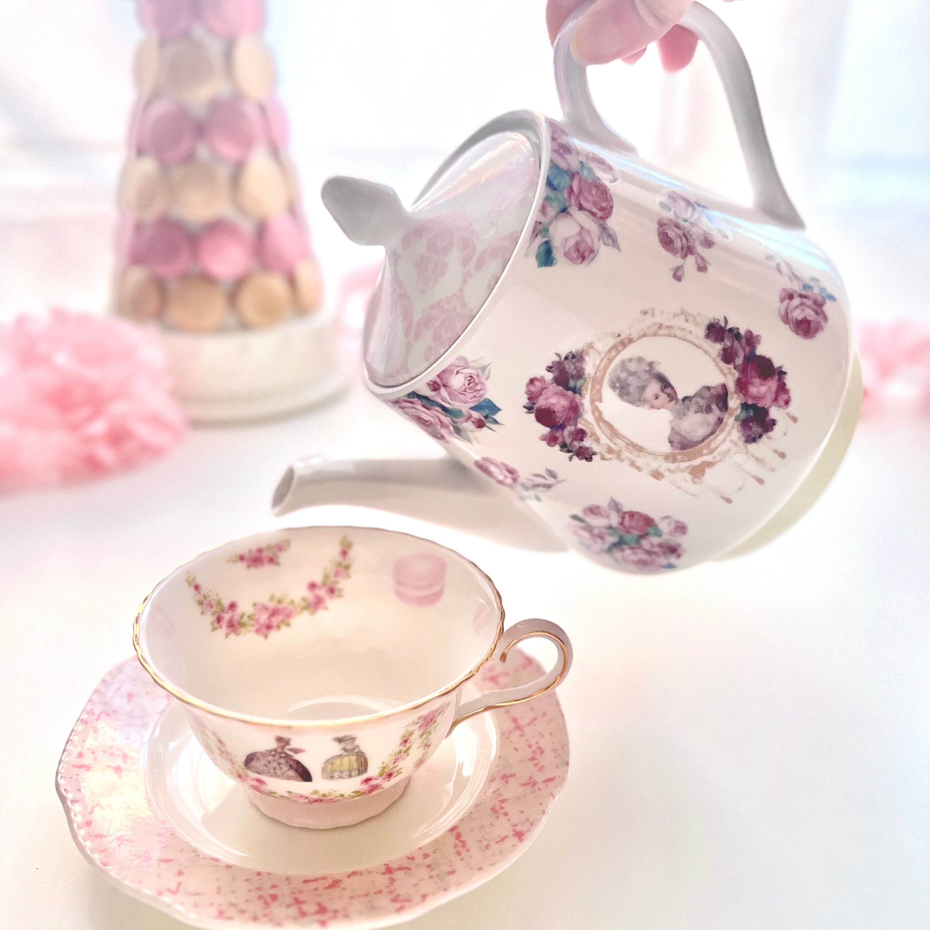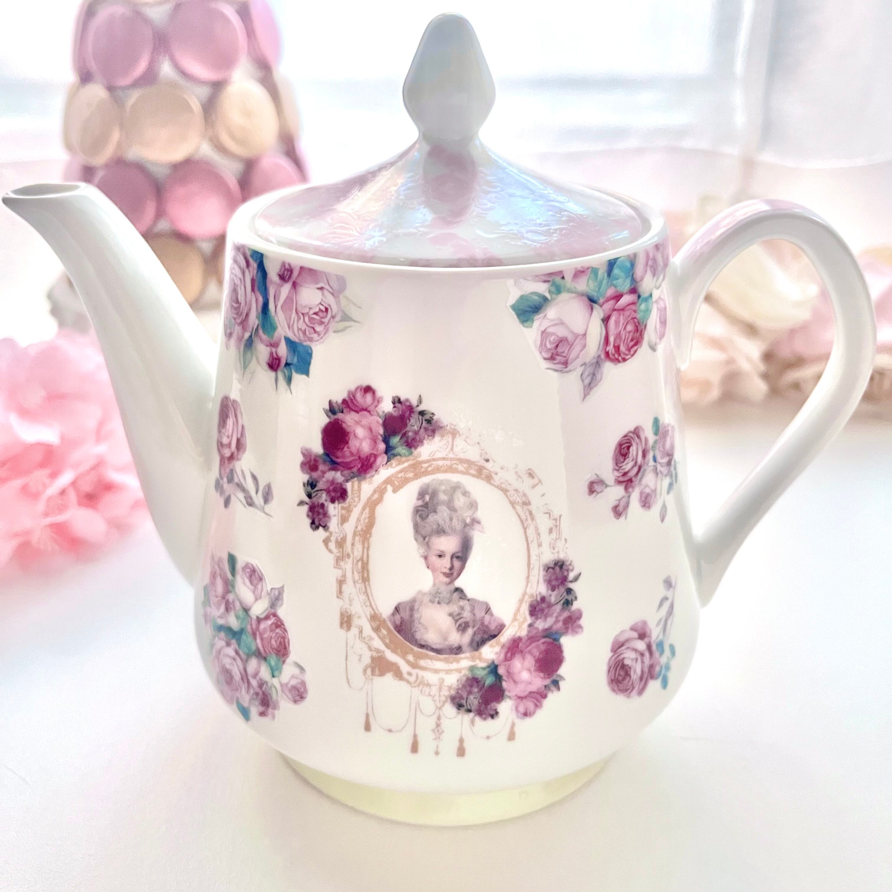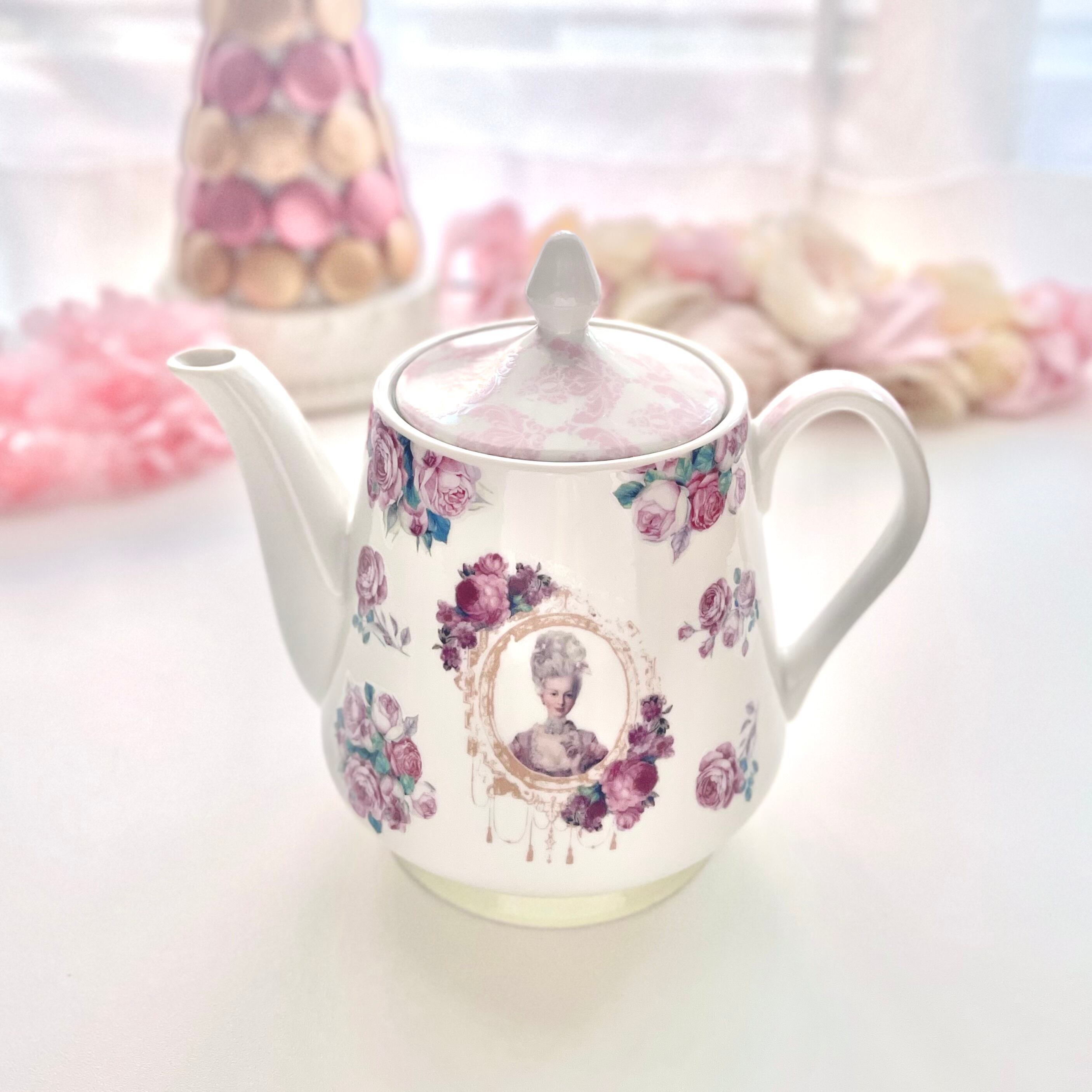 【イニシャル入】たっぷりのピンクローズとマリーアントワネットのかわいいティーポット 陶器 磁器