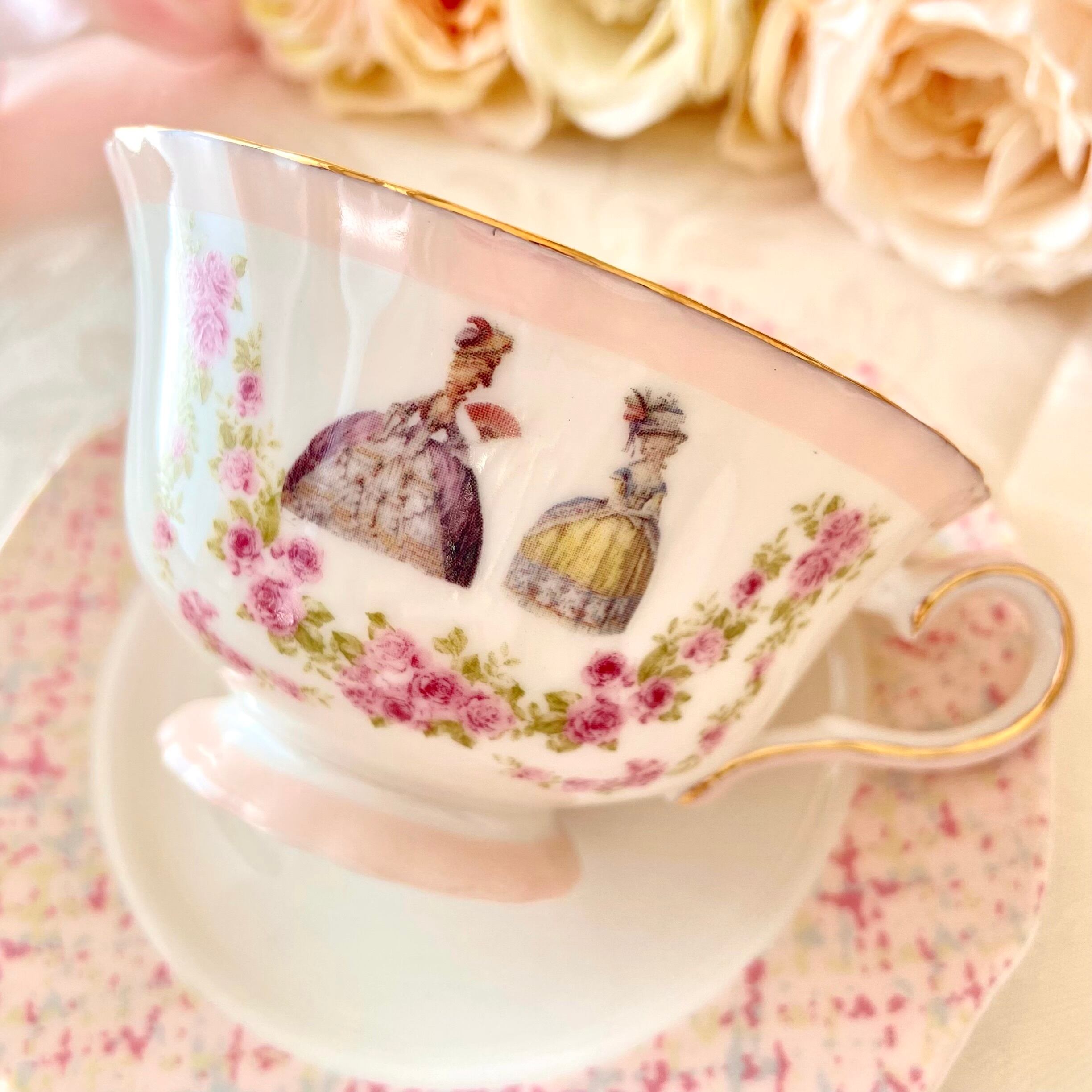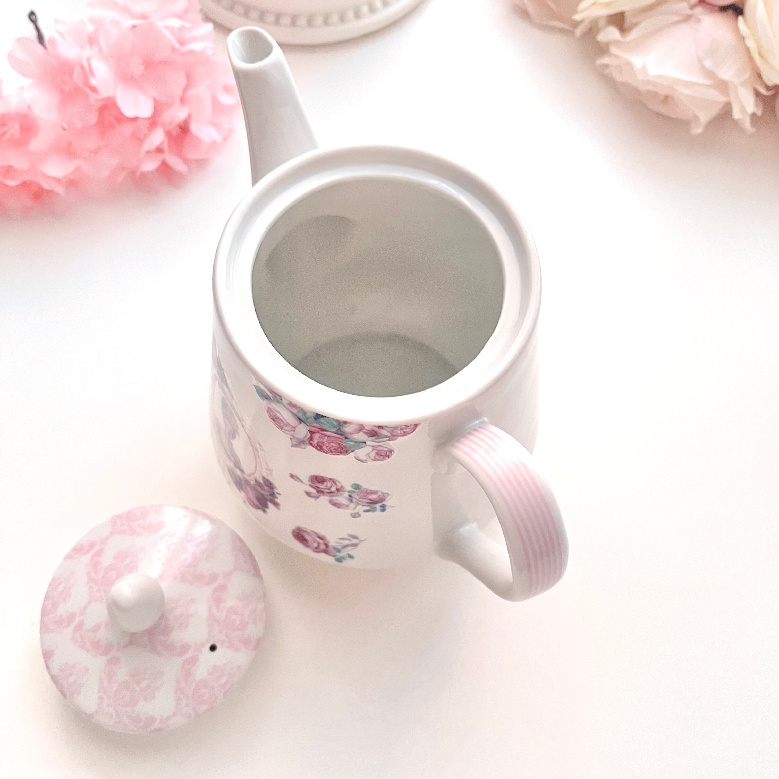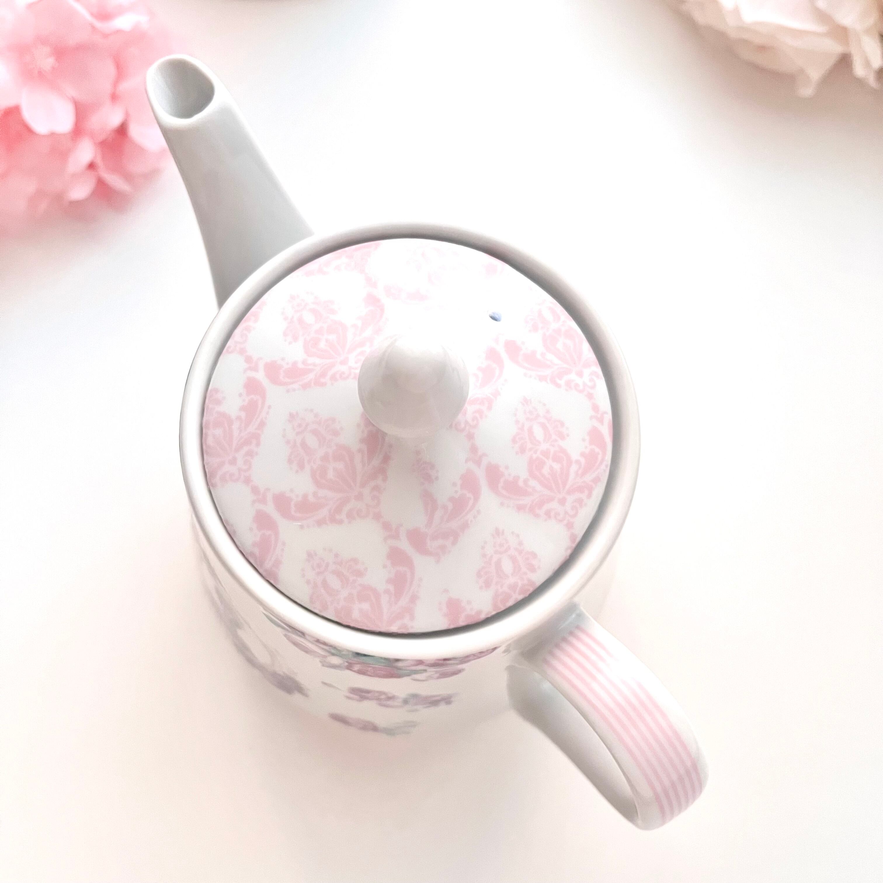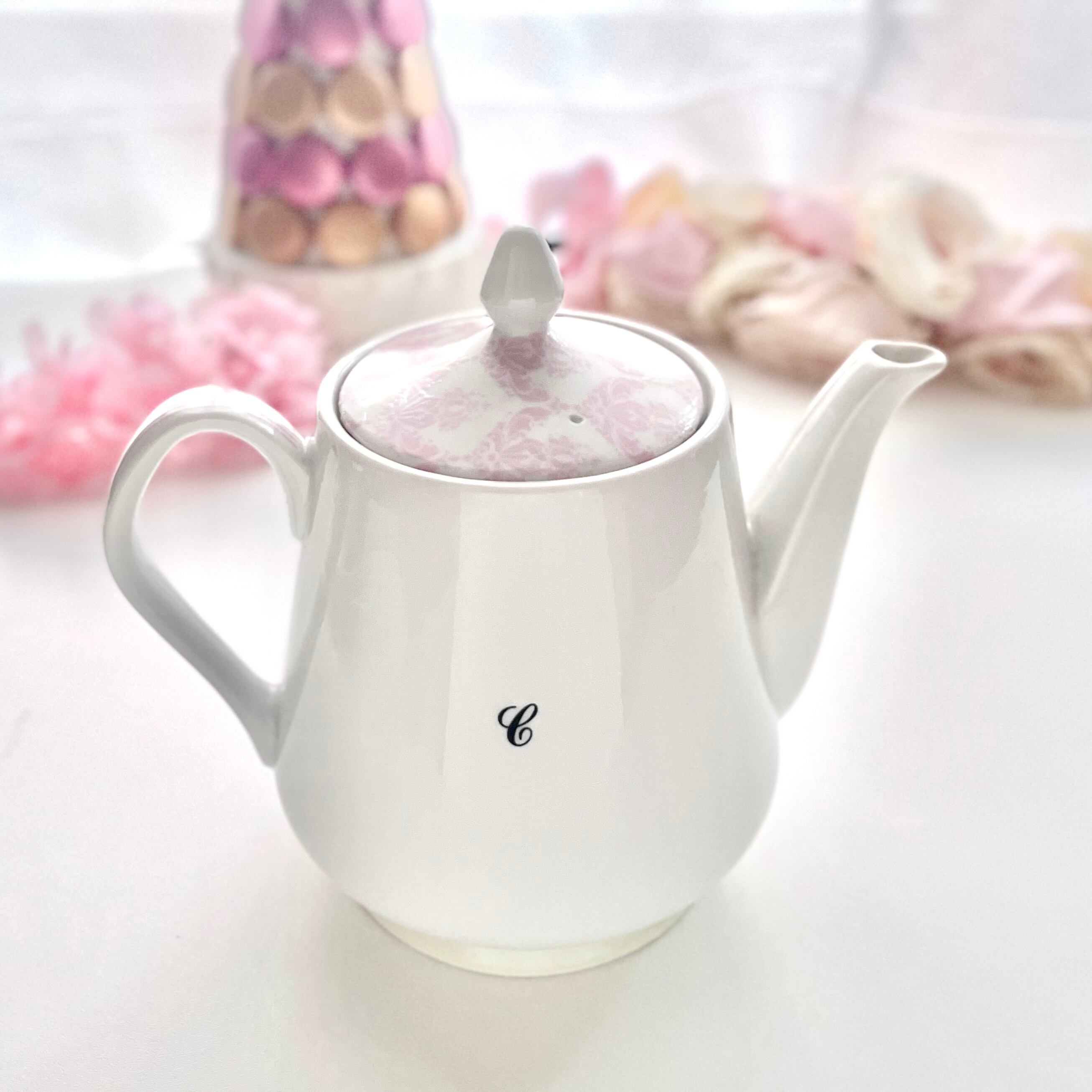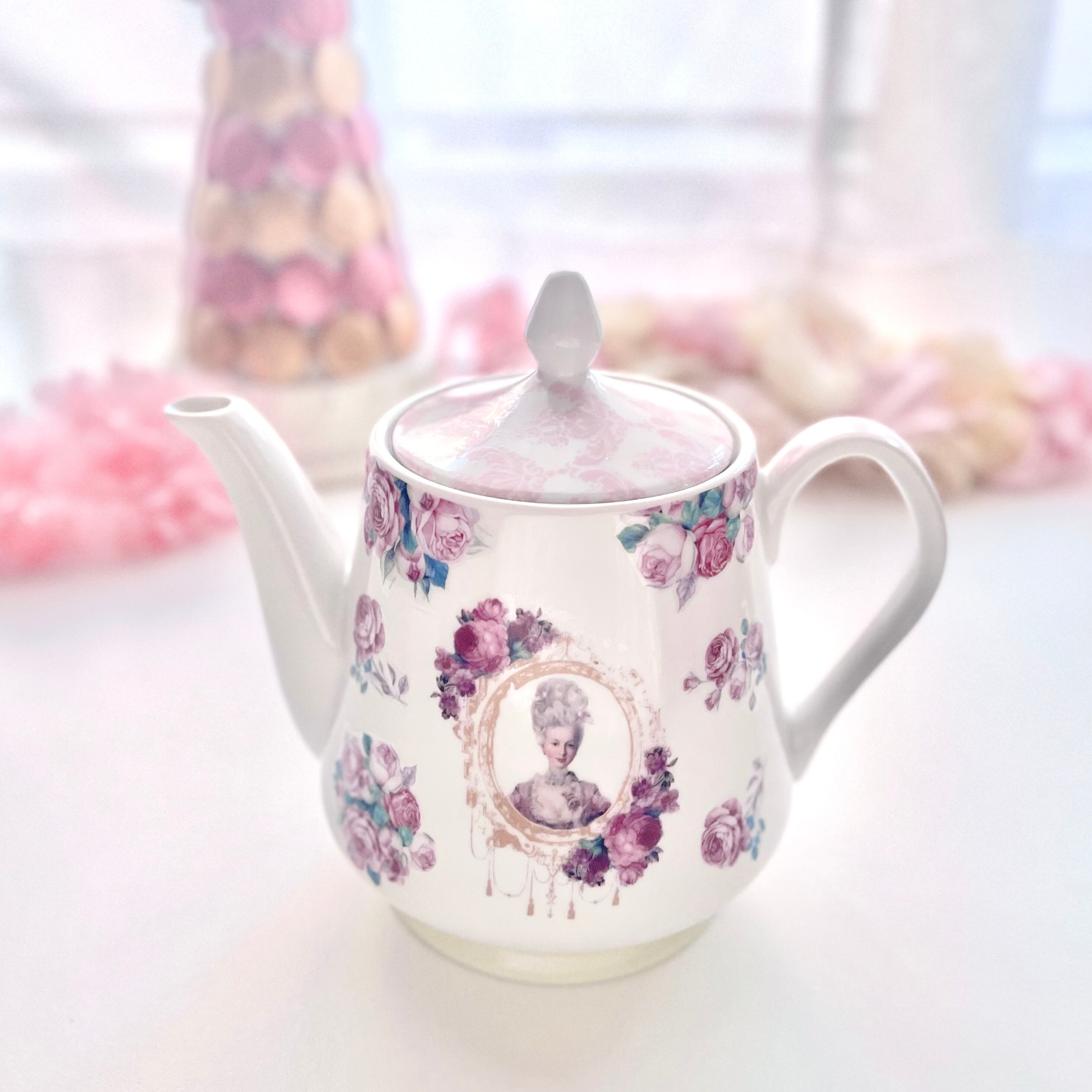 【イニシャル入】たっぷりのピンクローズとマリーアントワネットのティーセット エレガント かわいい ツィード ティーポット ティーカップアンドソーサー 小皿 陶器 磁器