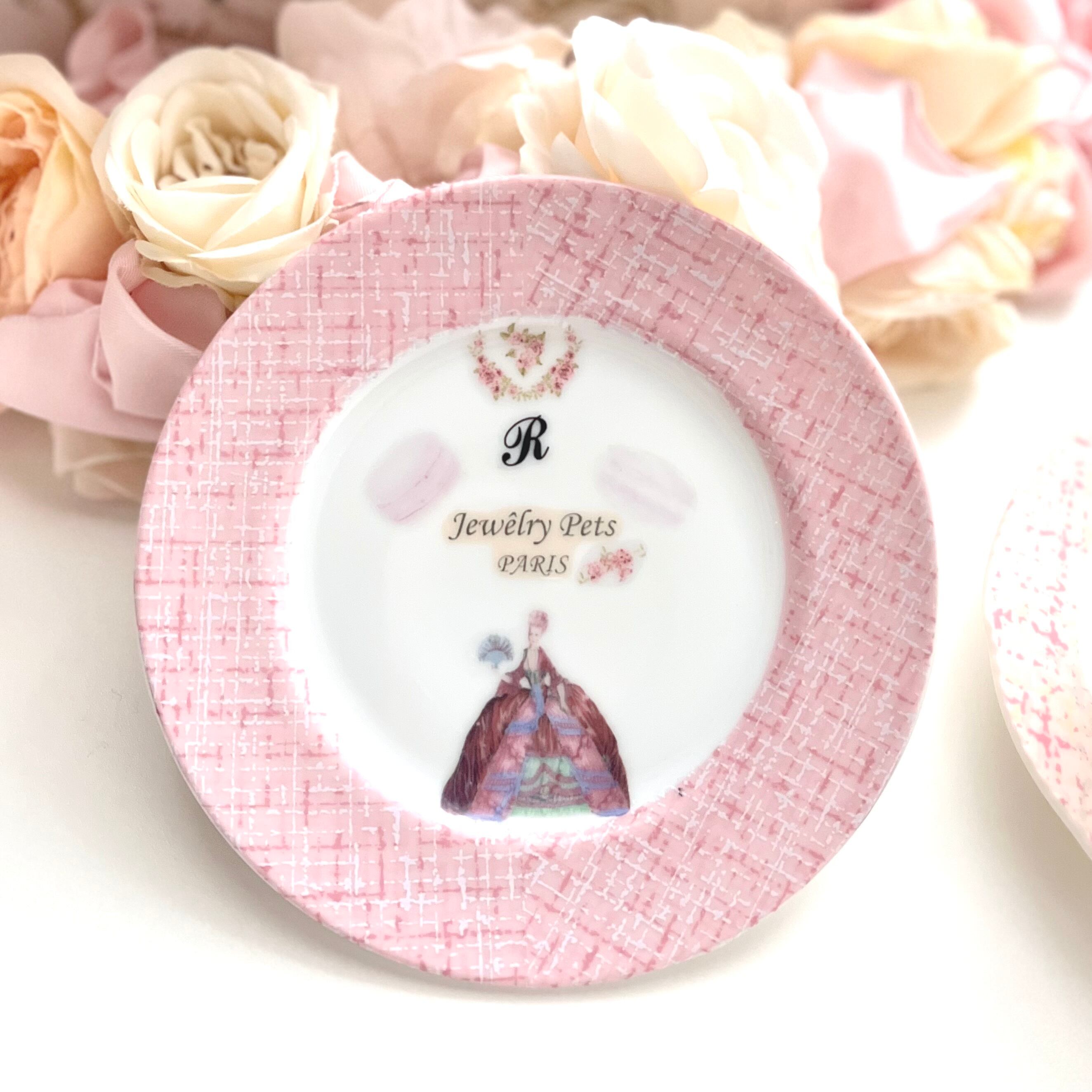 真っ白ツヤツヤのお皿をピンクツィードで仕上げました。