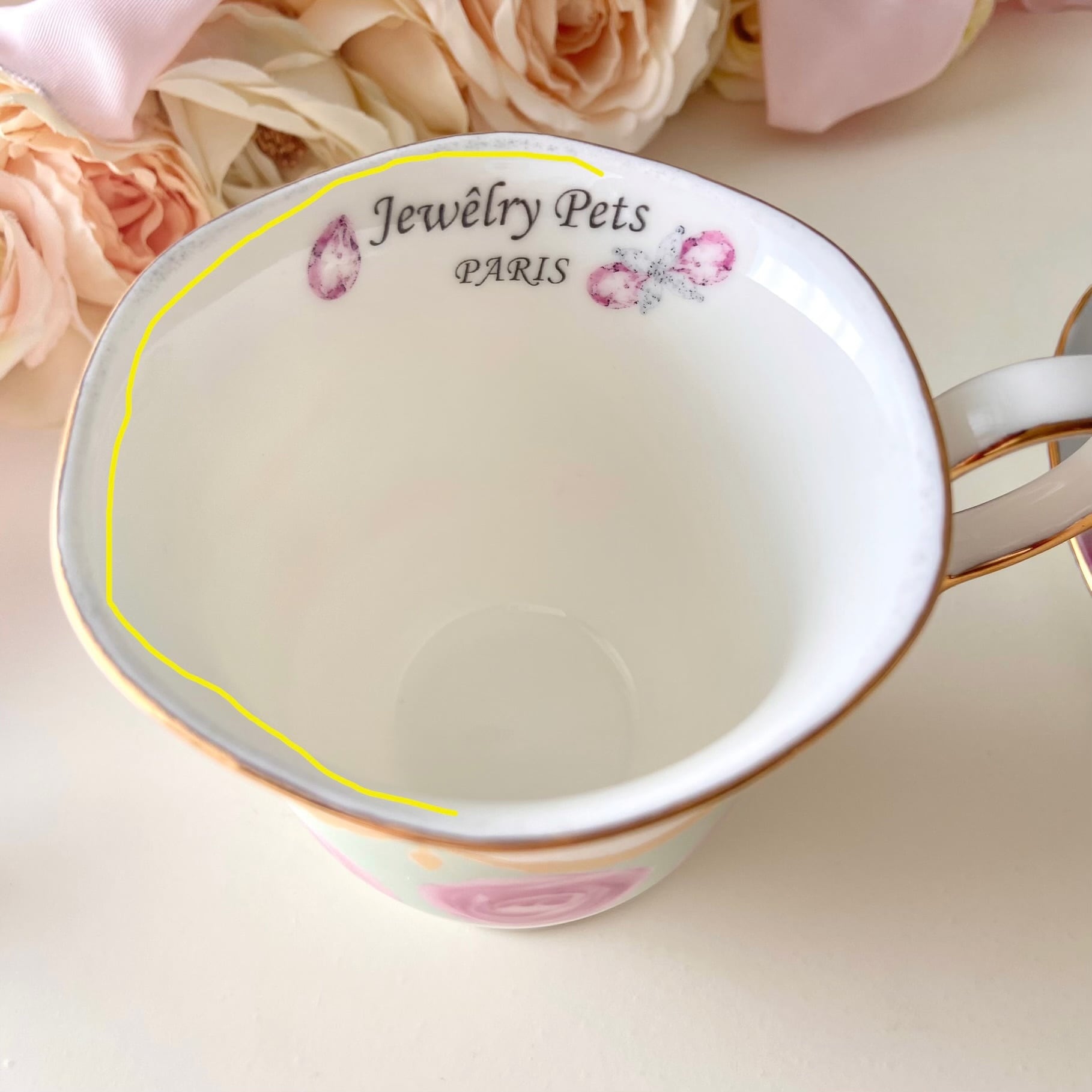 ジュエリーペッツの定番柄である鮮やかなローズが映えるよう、ピンクやグリーンを背景にあしらいました。