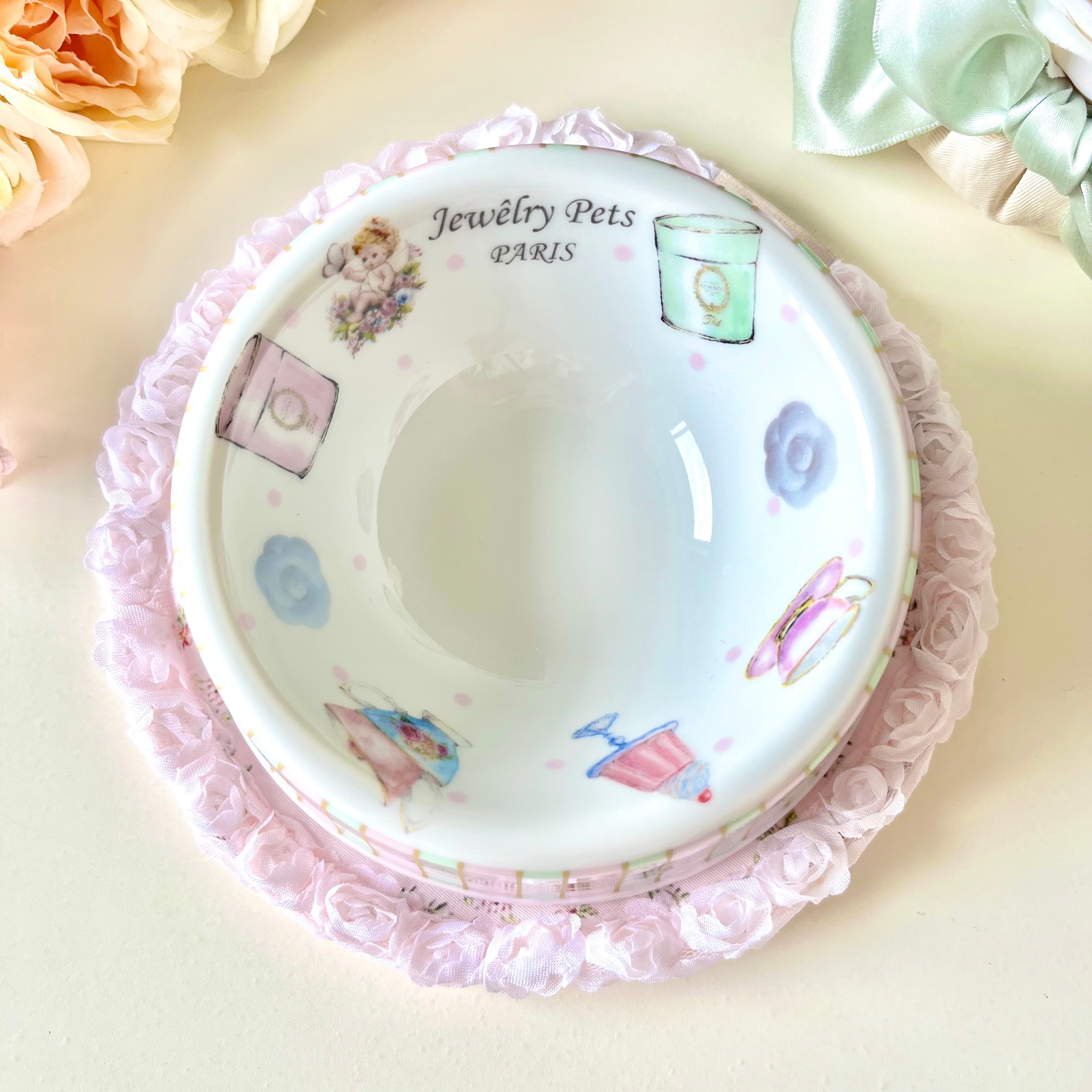 お姫様なペットちゃん用 ピンクとグリーンストライプのかわいいフードボウル 天使 カメリア 陶器 磁器