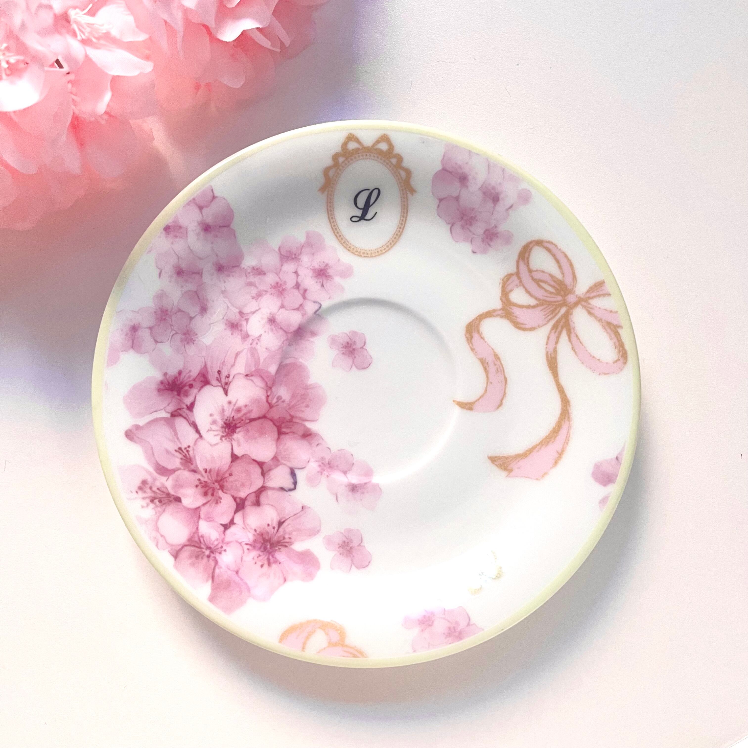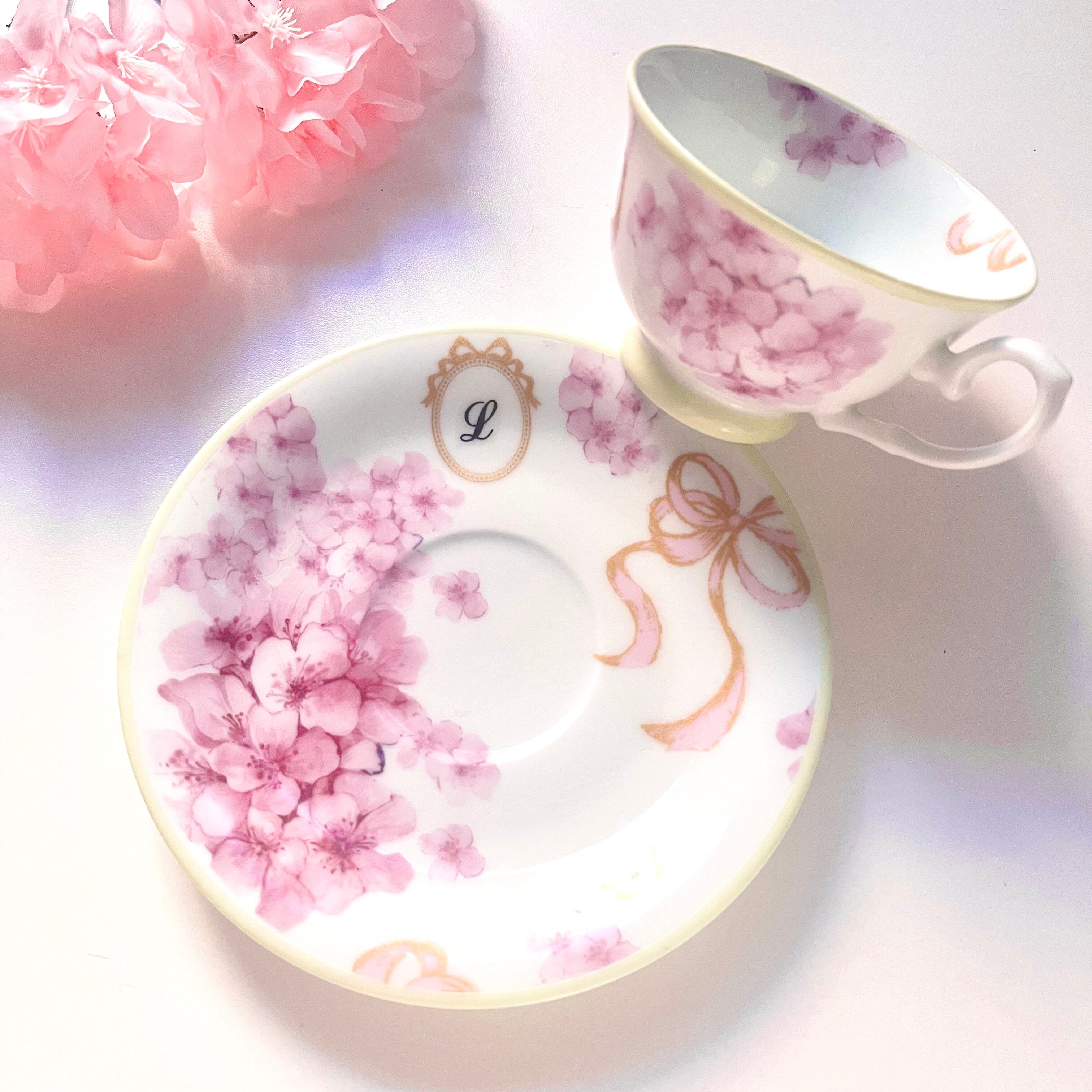 【お名前orイニシャル】桜とリボンのティーカップアンドソーサー 春 ピンク かわいい エレガント 姫系 陶器 磁器