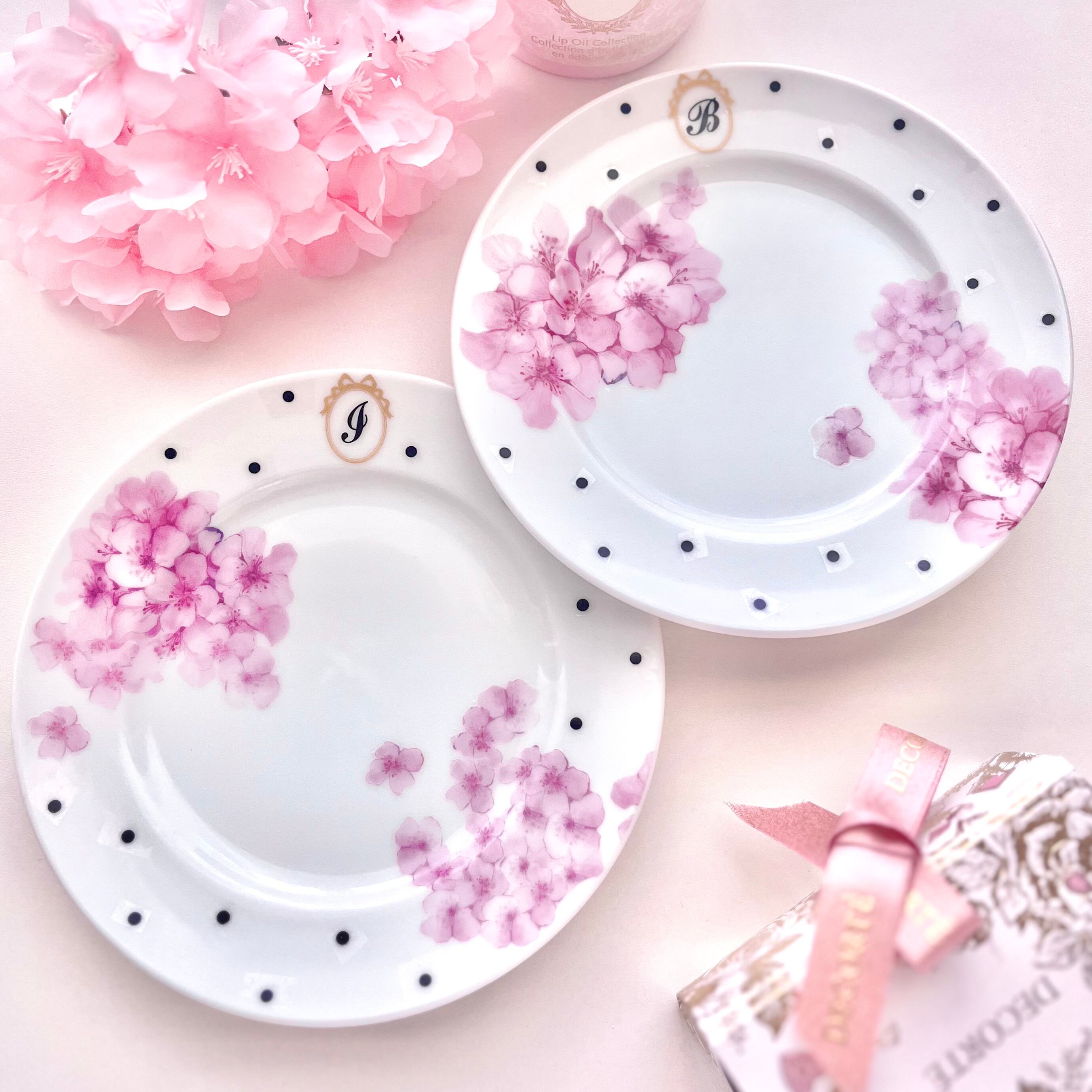 【お名前orイニシャル】春爛漫♡ピンクの桜 デザートプレート さくら かわいい 小皿 デザート皿 リム 16cm イニシャル入れ無料 春カラー 陶器 磁器 日本製 国産